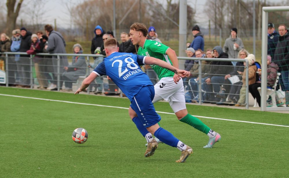 Alles schien angerichtet für einen wunderbaren Fußballnachmittag. Rein sportlich und ergebnistechnisch sollte es das für uns nicht werden. Die Zuschauer durften insgesamt eine umkämpfte und ausgeglichene erste Halbzeit sehen – vielleicht mit leichten Vorteilen für unsere Heimmannschaft, wobei die größte Möglichkeit kurz vor der Halbzeit an die Jungs vom TSV aus Friedrichskoog ging, als ein Heber aus der Luft zwar über Torhüter Ben-Luca Delfs, aber knapp am Tor vorbeiging.