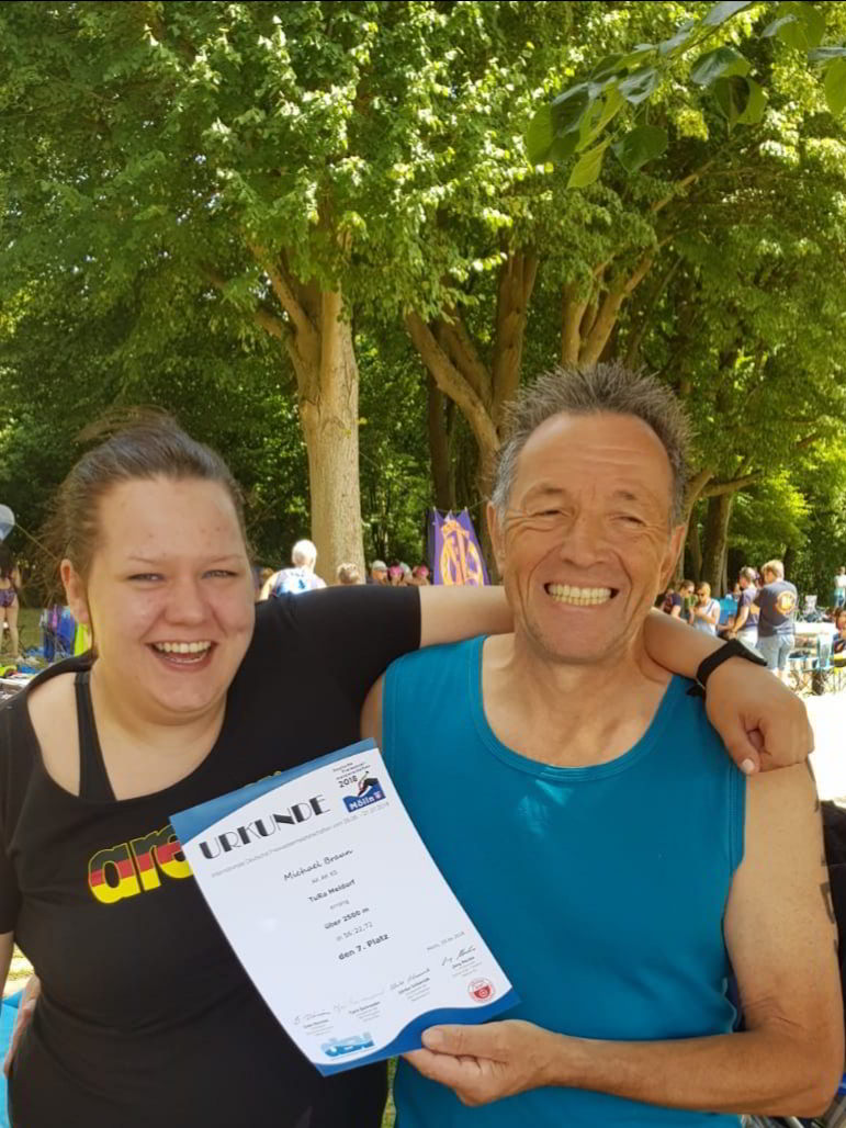 Am 29.06. nahmen Miriam Obersteller (AK 25) und Michael Braun (AK 65) an den Deutschen Meisterschaften -Freiwasser- in Mölln teil. Bei bestem Sommerwetter, 28 Grad Luft- und 23 Grad Wassertemperatur konnten die beiden in der Eulenspiegel-Stadt zeigen, dass die TuRaner nicht nur Becken, sondern auch sehr wohl Freiwasser können.